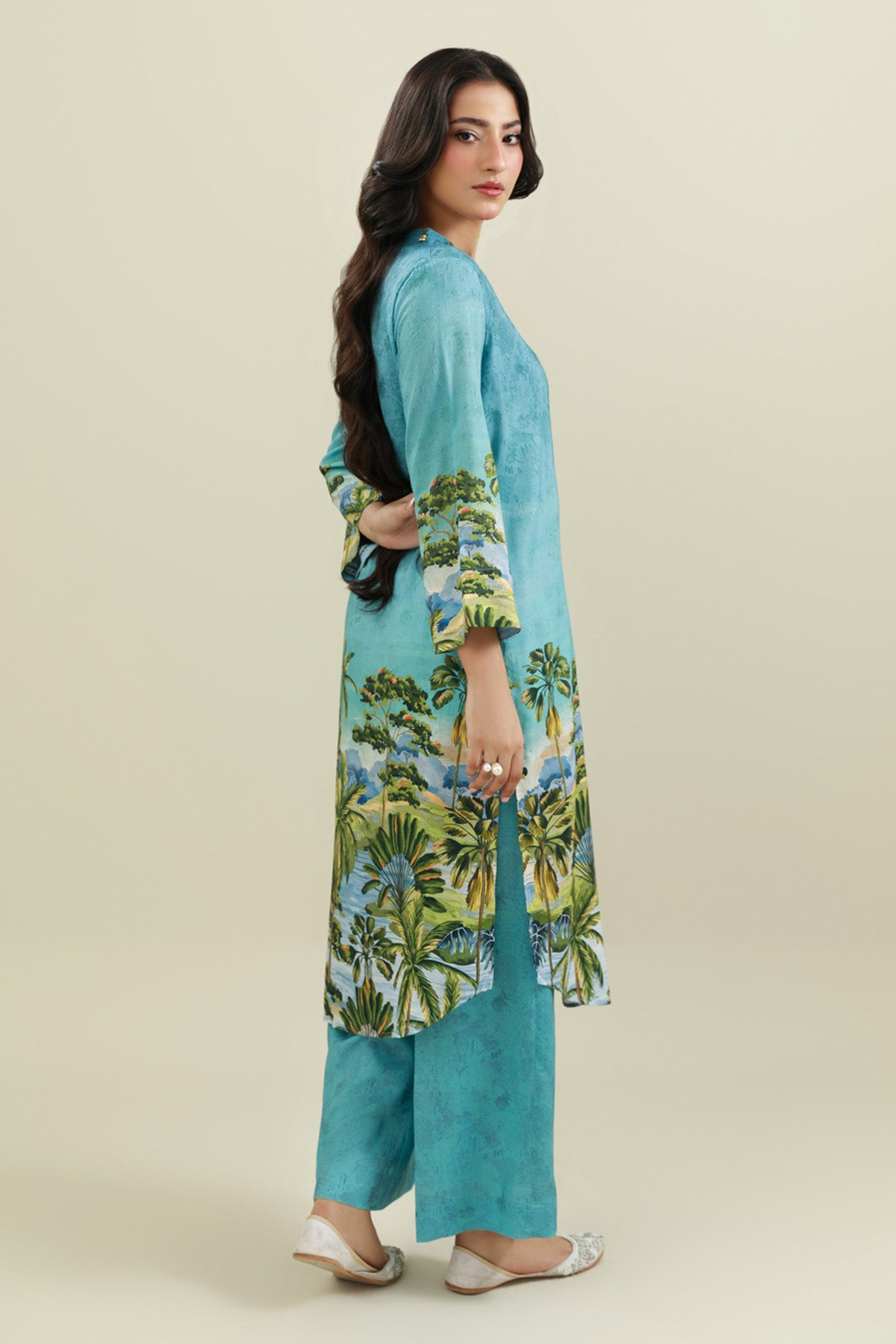 Embellished V-Neckline, Full Sleeves, Round Hem, High & Low Shirt