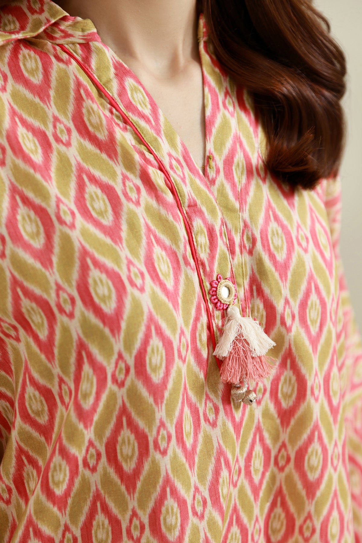 Collard Neckline With Front Slit, Tassel with mirror at Front, Quarter Sleeves With Slit, Round Hem, Long Printed Shirt