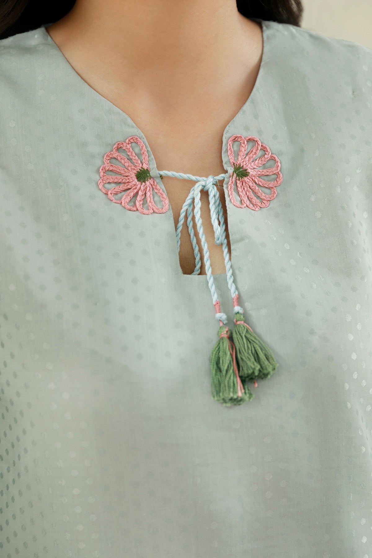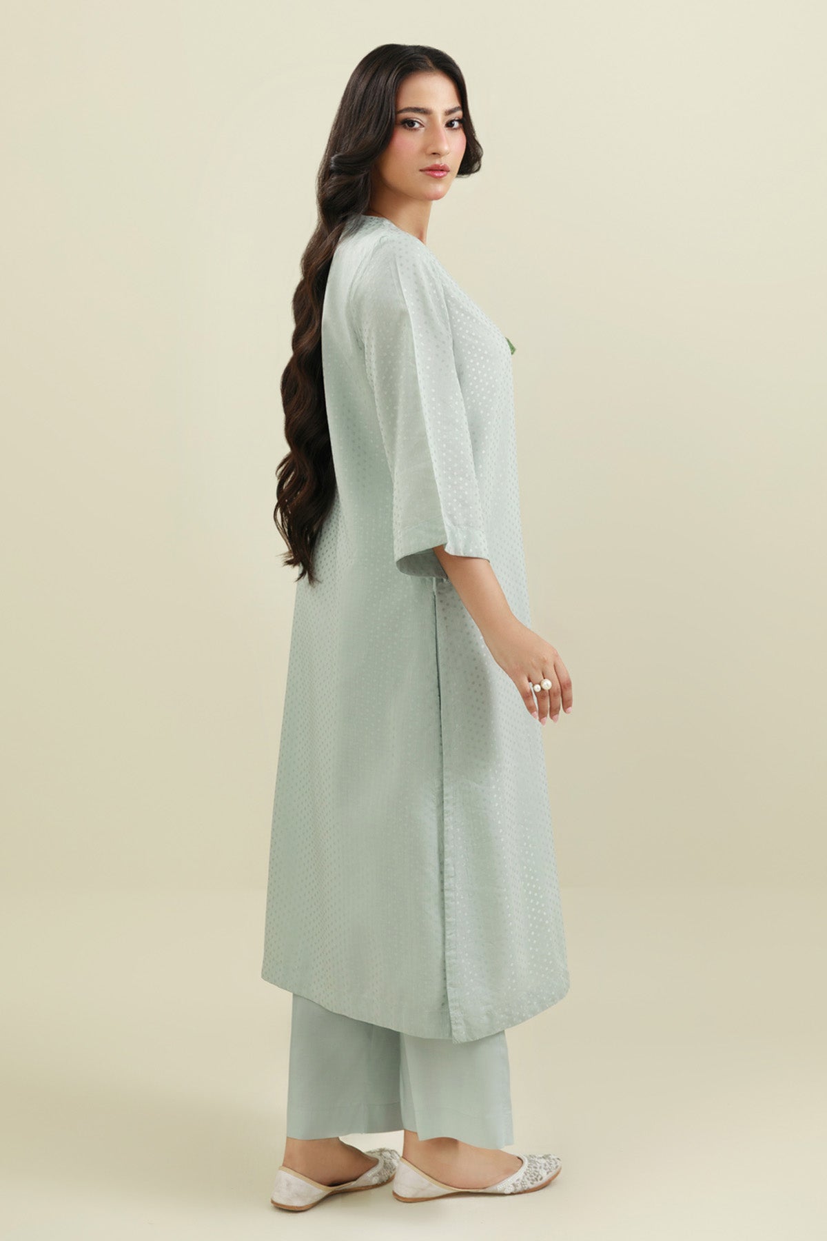 Round Neckline With Slit, Embellishment At Front, Quarter Sleeves, Long Shirt